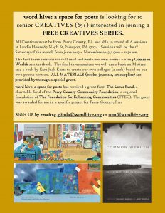 All Creatives must be seniors (65+) from Perry County, PA and able to attend all 6 sessions.